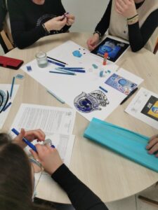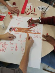 Papiers, feutres, découpages, dessin, peinture… Chaque table de 3-4 résidents mélangés à des élèves ont pu réfléchir ensemble aux différentes émotions et les représenter : peur, joie, tristesse, colère, dégoût. Un moment vécu très convivial, des éclats de rires, quelques larmes…